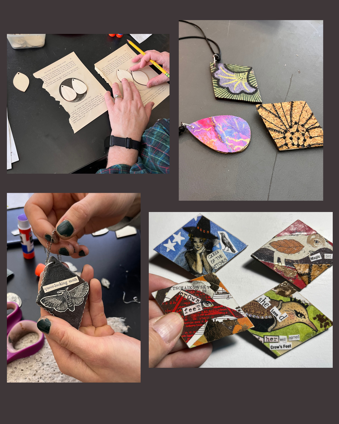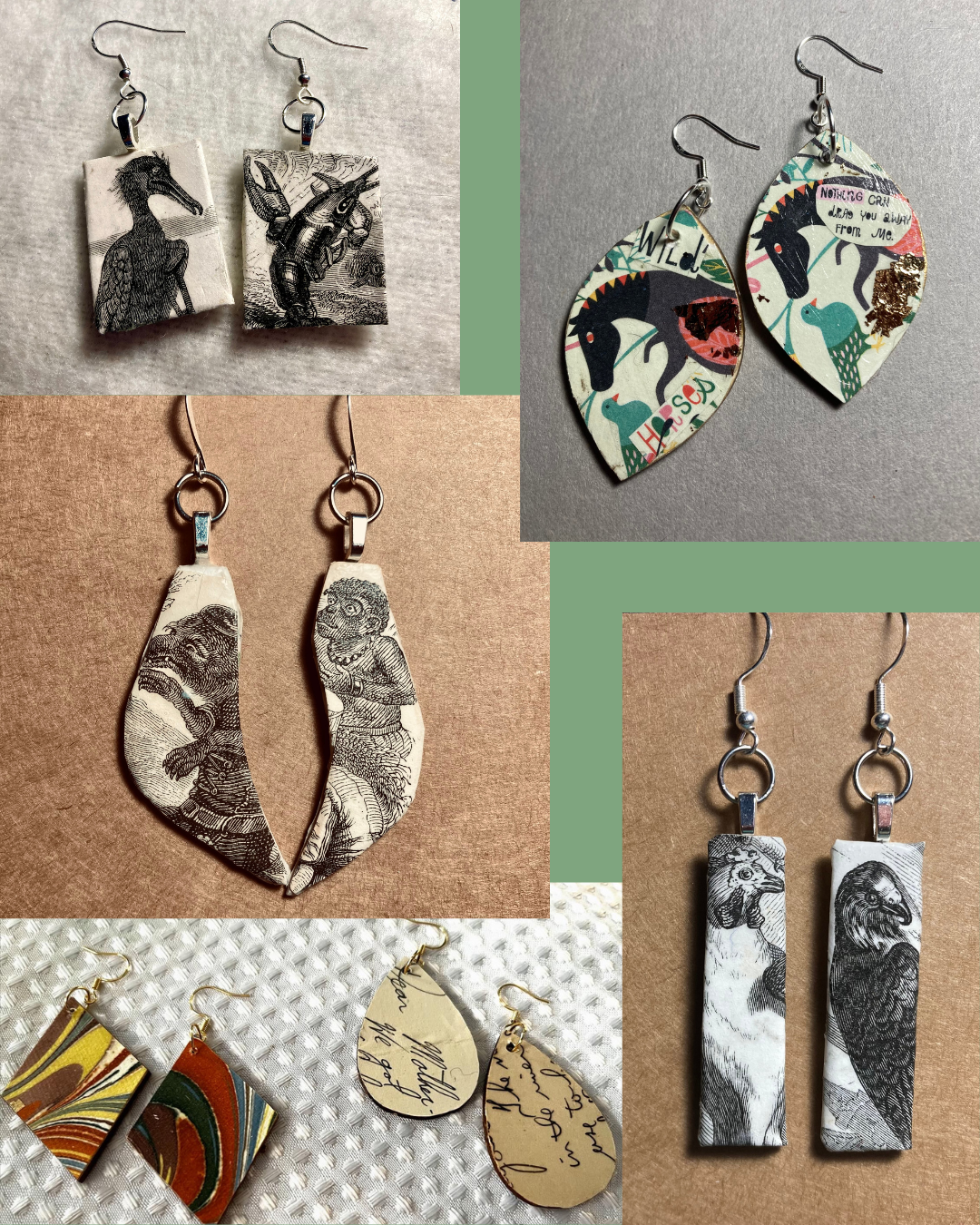 We will use different kinds of paper such as old maps/books, vintage magazines, origami paper, handmade paper, and so much more. The process includes using a thin wood base in various sizes and shapes and papers are applied with several types of adhesives. Also included are leather and beads as embellishments. They are then sealed and findings are attached.