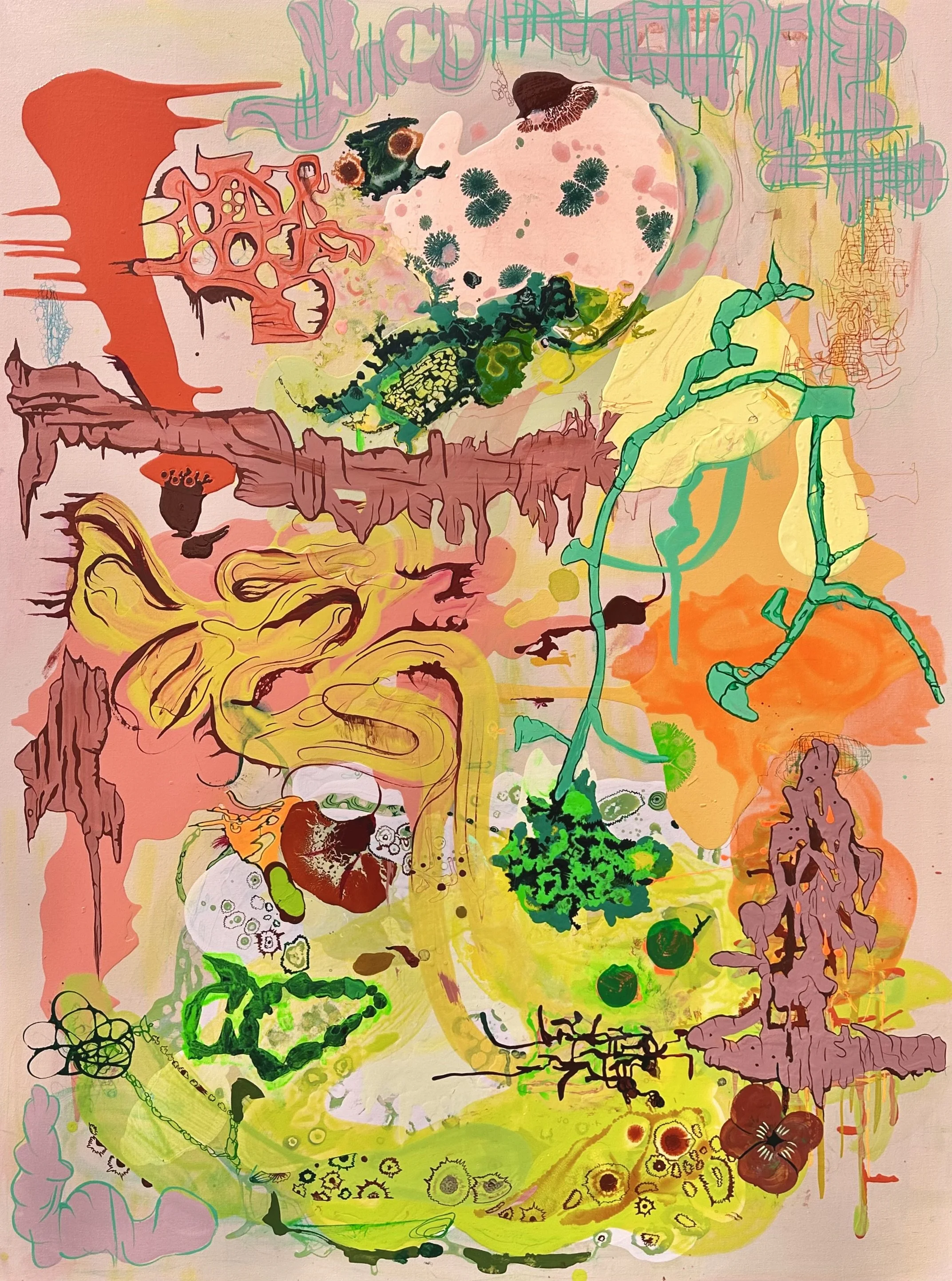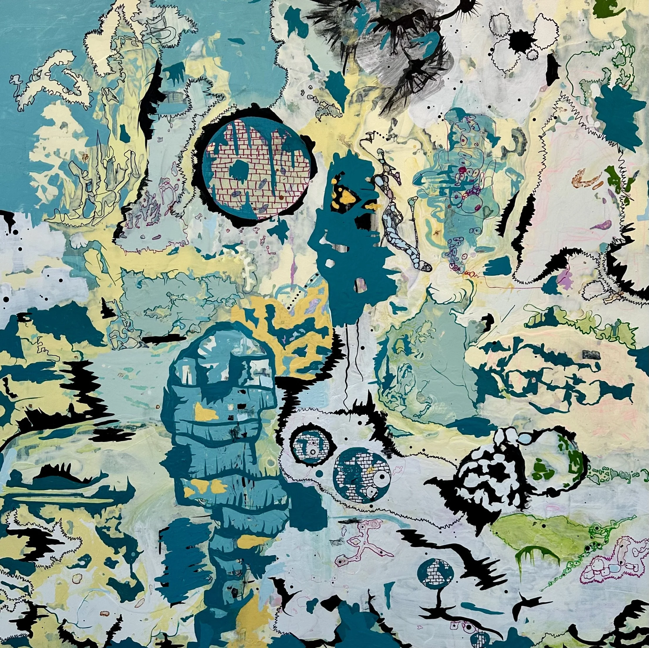 Joseph Stabilito "DEAD END", acrylic on canvas. I’ve been turning to art since my childhood as a way to express myself. In my early years, I was aligned with abstract expressionism. I followed the heroes of the day, anxious to learn the craft of painting. I flirted with differing styles and techniques of course. But my love of color and design were always eminent. Another constant in my work is the attention to surface typography. My newest paintings surge and pop with electricity. I begin by pouring paint onto my canvas. I’m influenced by everything I’m seeing in my world. Pattern, composition, and line are always considered. There’s a primal beauty I’m out to capture. Color is a trusted tool in my arsenal, and I’m not afraid to be seduced by it. I approach each piece intuitively, allowing myself to be pulled into its orbit. I give myself permission to experiment and push into uncharted territory. It’s the process of making that draws me into the work. Contextually, I’m playing with surrealism, but narratively I’m pulling rom anatomy, pop art, graffiti, and more. Swirls inhabit shapes that coalesce around networks, Doodles and drawings overlap the dimensional space. But in the end, what I’m offering the viewer is an invitation into my world. And I’m hoping that they will find a beauty and mystery in it.