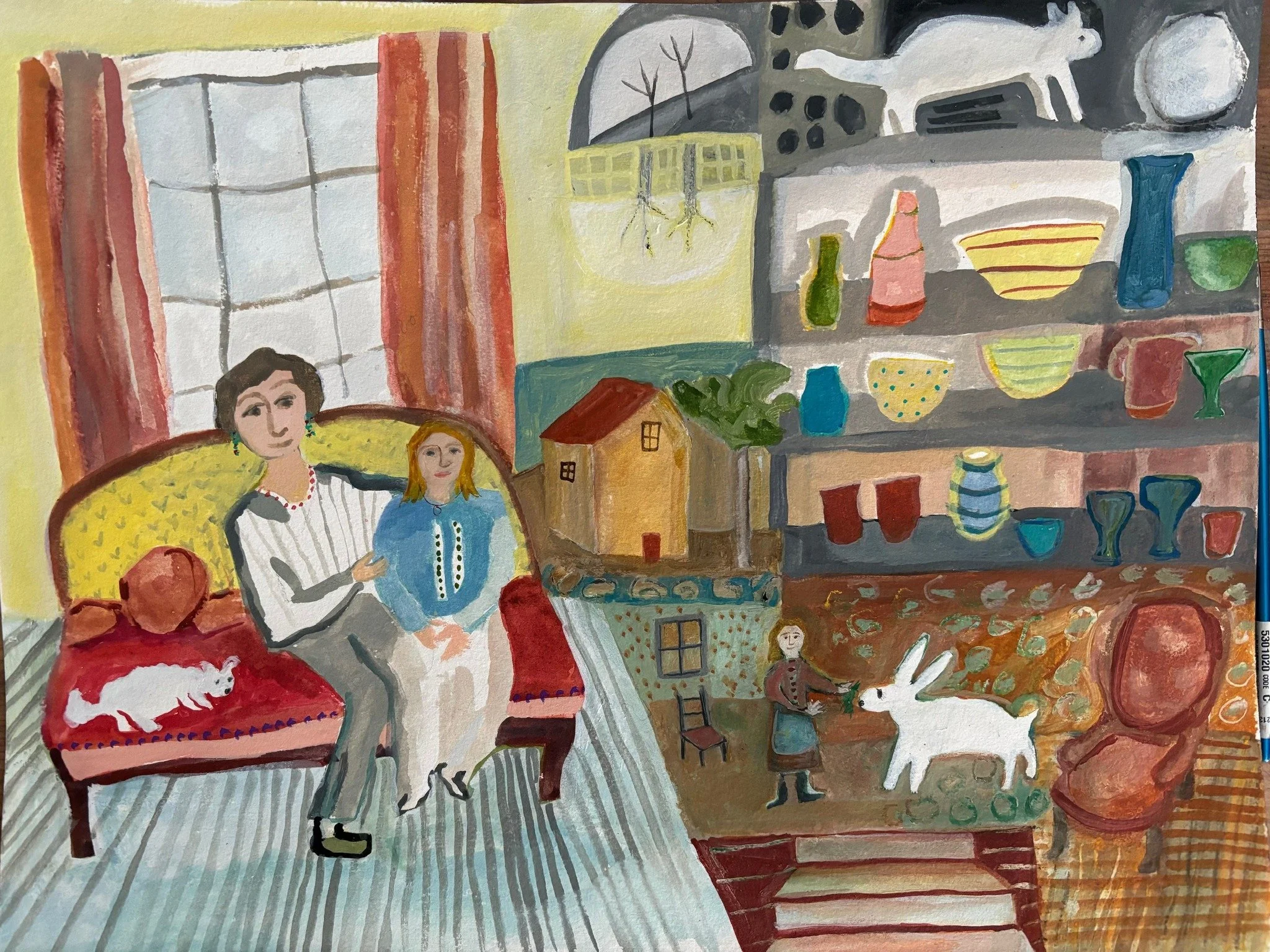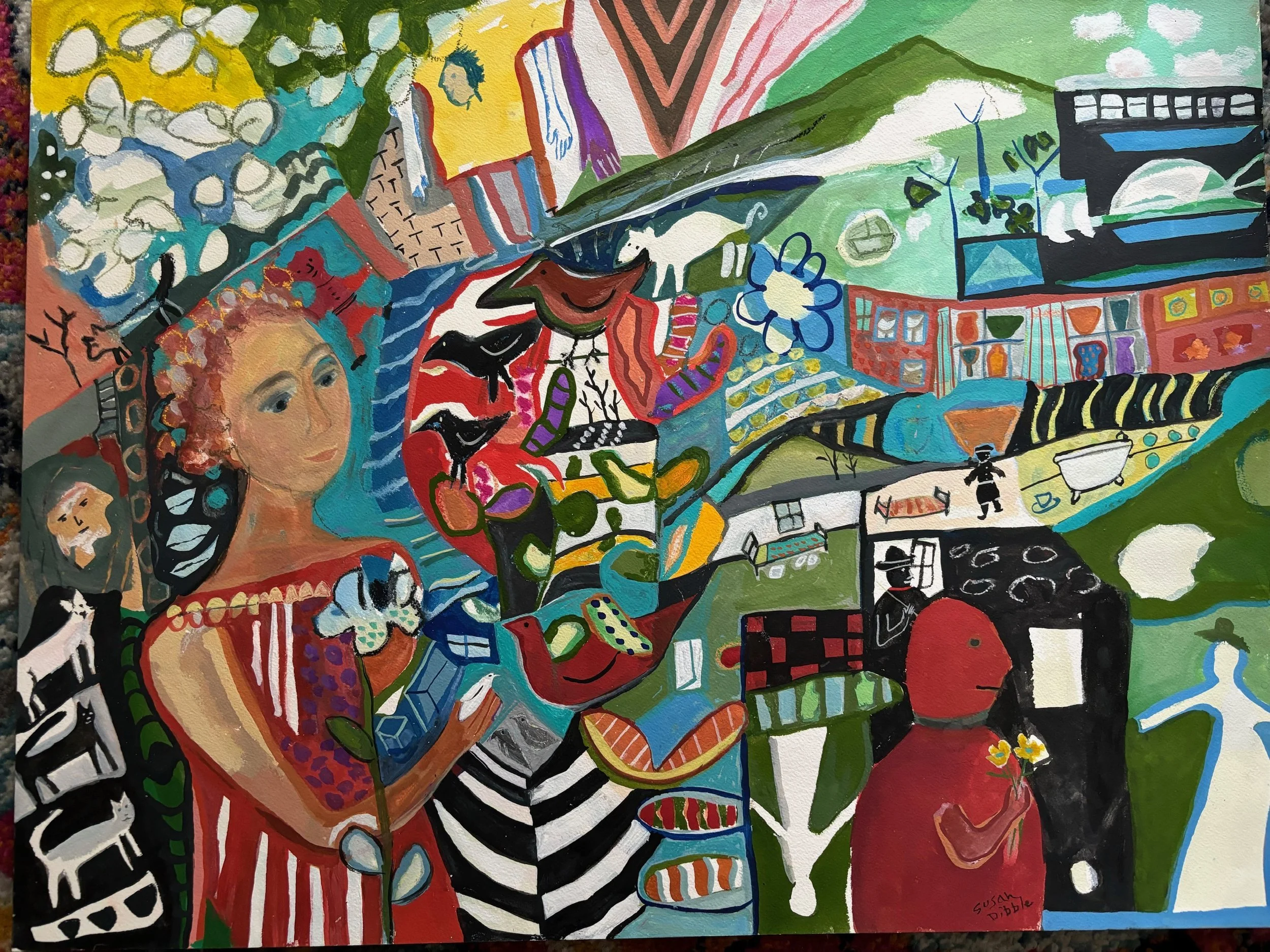 Susan Dibble: In my paintings I try to find a balance between order and chaos. I focus on the composition and arrangements of images so that when the painting is complete an energetic movement is created by how line, color, form, and figure come together to make the whole-a kind of order made by a collection of dynamic images and moments in time. I include numerous sections in each painting that capture stories, relationships, and conversations-a collection of experiences in my life transformed into symbolic imagery. I am a choreographer and think of my paintings in a similar way to making a dance in which there is movement created by combining rhythm, feeling, line and unpredictable positioning of action, color, symmetry, and asymmetry. When I sit down to paint, I am often surprised by what arrives on the paper. I am drawn to the possibility of joining mystery with clarity. In a way my paintings offer unthreatening complexity and chaos balanced with calmer and quieter forms. The balance of opposites is important to me and I try to show the dynamic energy that is evident in the movement between the opposites of order and chaos.